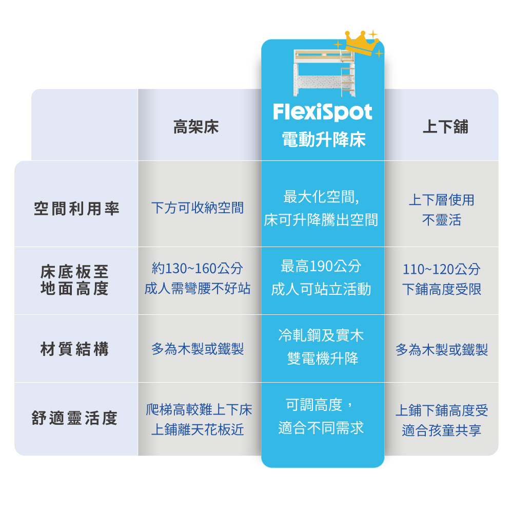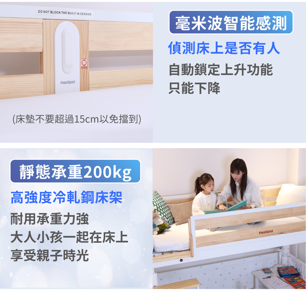 7.電動升降床不適合6歲以下兒童使用,避免造成跌落受傷的危險,請勿在床邊安裝掛鉤或把手,或懸掛繩子、皮帶,以免小朋友因玩耍而造成被纏勒的危險,建議6歲以上孩童使用。