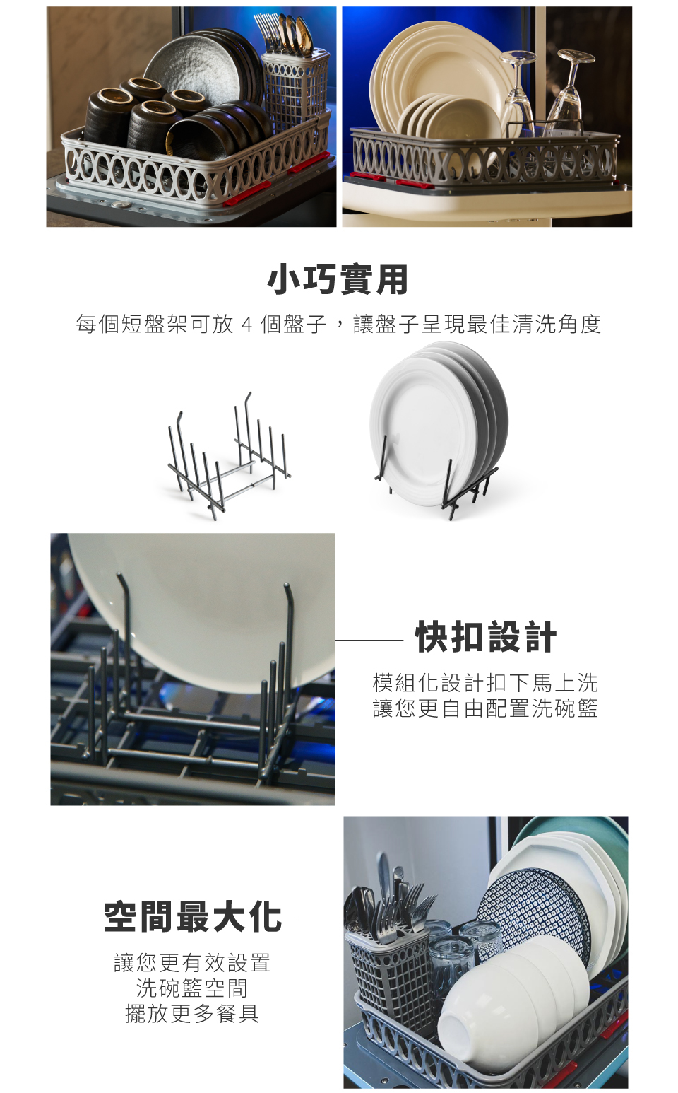 每個短盤架一次可放4個盤子,快速拆裝設計,能夠安裝在洗碗籃的任何位置,讓您更有效配置洗碗籃。